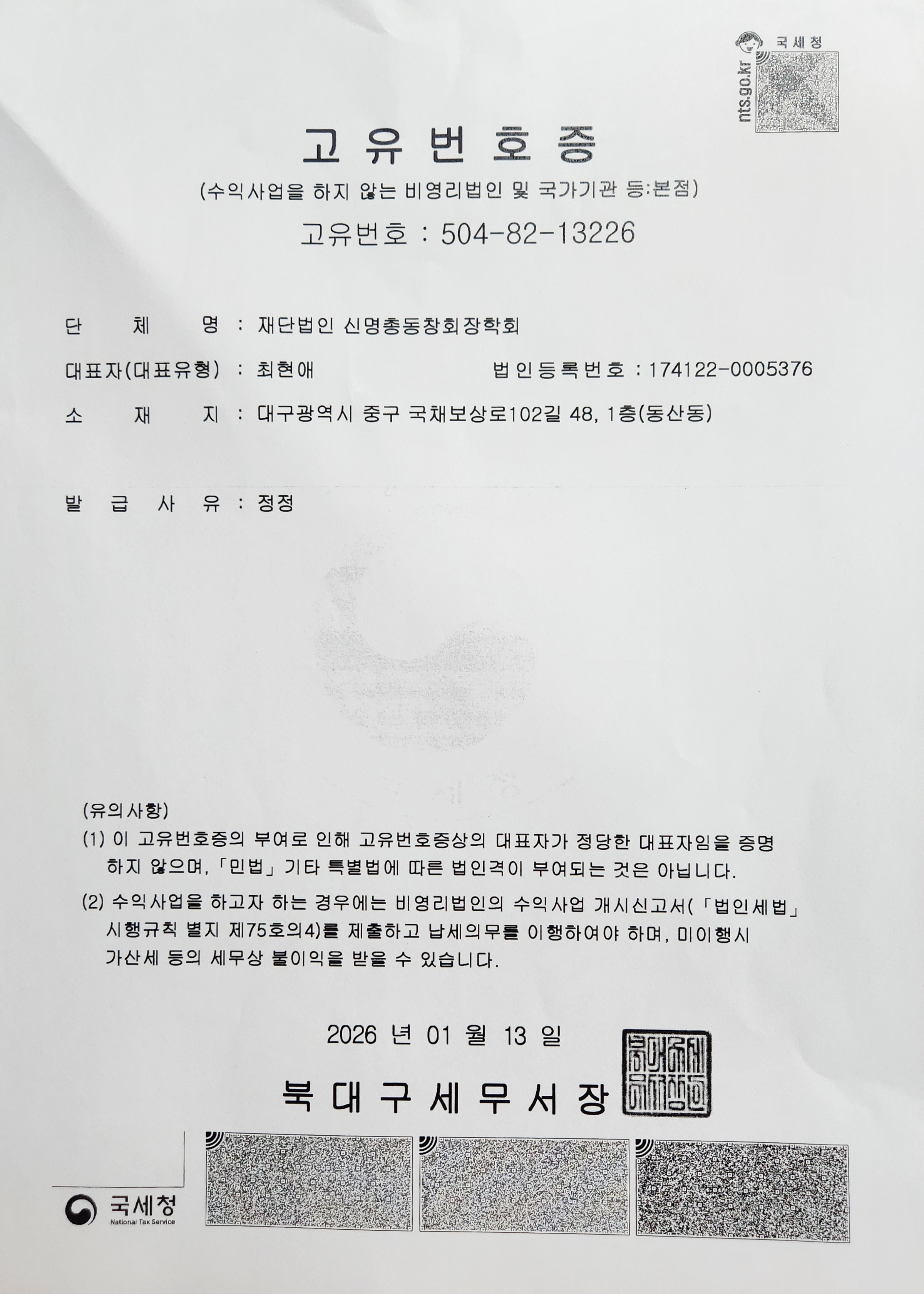 ![]() 2025년 11월 6일 제32회 이사회에서 새로운 이사장님이 선임되시고, 임원이 변경되어, 동부교육청 승인, 대구지방법원 등기국 등기 완료한 후 북대구세무서에서 고유번호증을 다시 교부 받았습니다. |