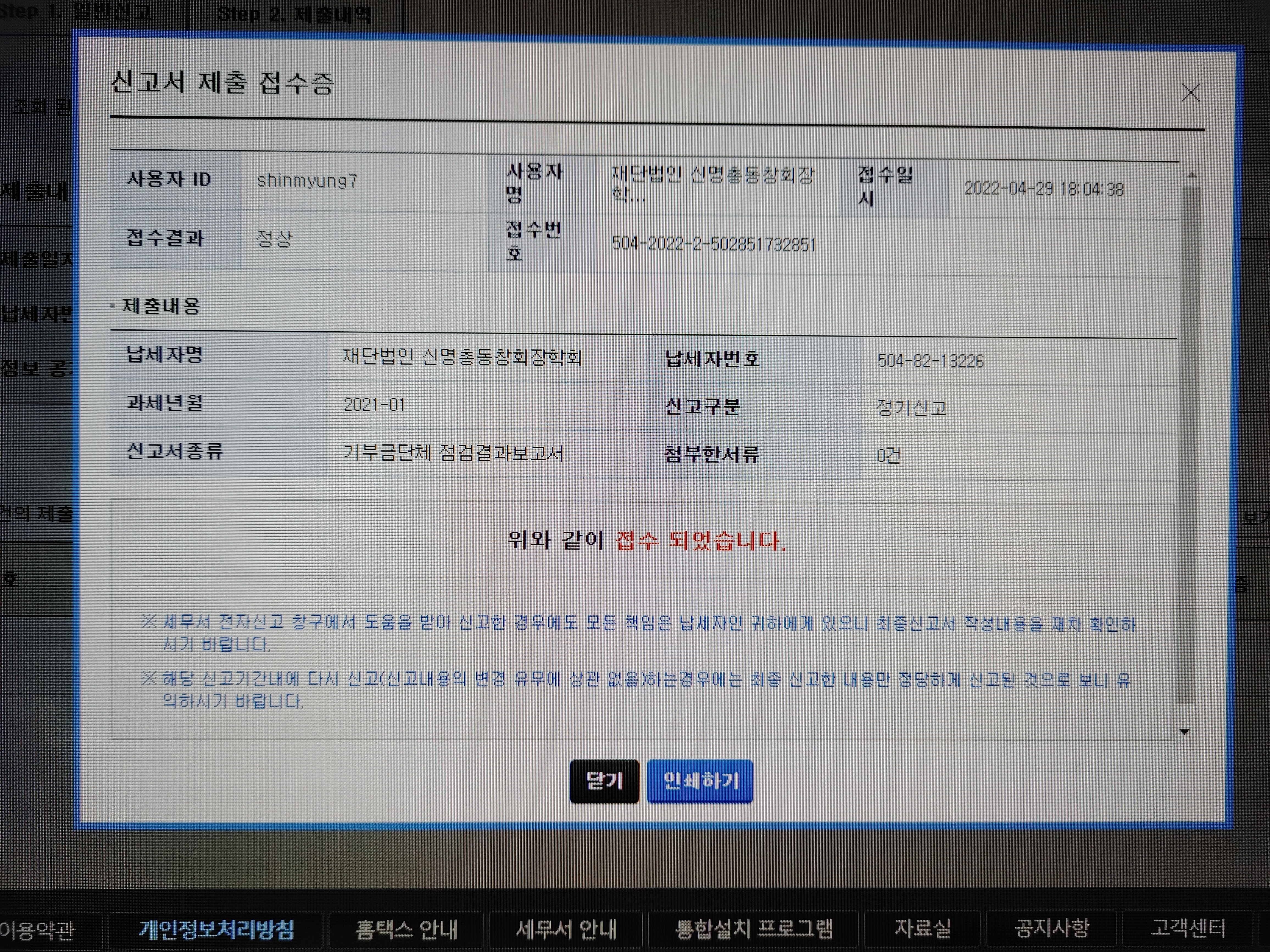 2021년 공익법인등 의무이행여부 국세청 보고 완료 2022-04-29 23:29:00 |